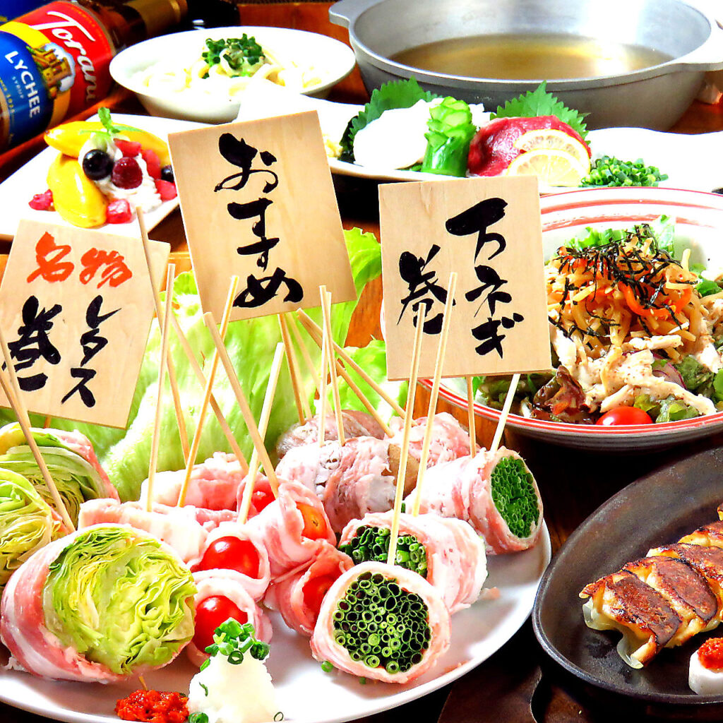 きばくもん名物の野菜巻き串、ひとくち餃子、博多名物をお手軽に堪能できるコースです!席時間は2時間とゆっくりしていただけます♪