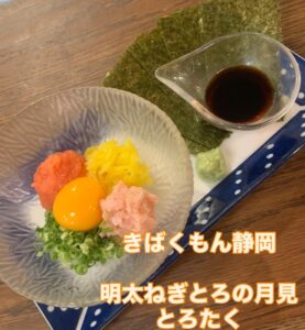 酒の肴として人気のある月見とろたくは、甘口醤油をかけて海苔に巻いて美味しく召し上がれます!!