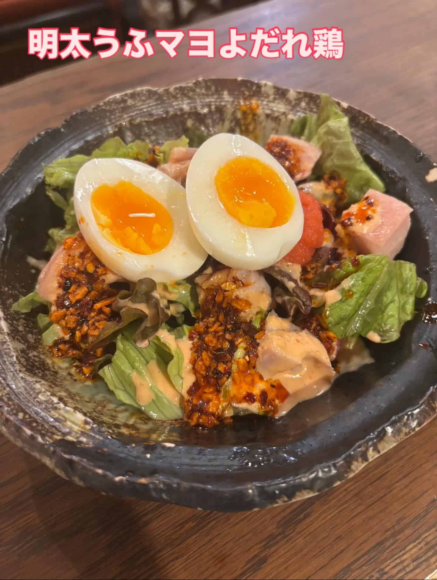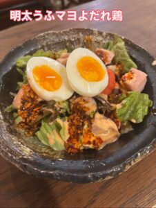 明太マヨのまろやかな味わいと、ラー油のピリ辛の味わいで不思議な味わいです!!