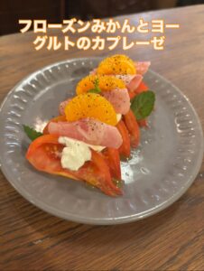 トマトとみかんの甘みと、生ハム、ヨーグルトの酸味が程よくマッチしていて、不思議な味わいの逸品です!!